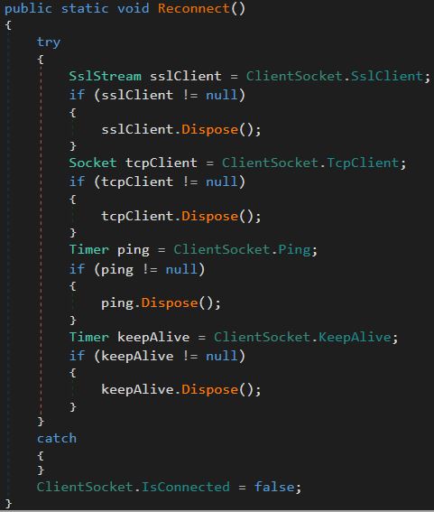 After the try-catch block is completed an infinite loop is created where the the sample will check if there is a socket connected to this process, if there is the sample will sleep for 5000ms, if there isn't a socket connected the sample will call two functions. The first function called by the loop is ClientSocket.Reconnect().