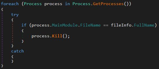 This function starts by checking to see if the module's file name is the same as the one set in the configuration. In this sample, it's set to "%APPDATA%/python2.09.exe. If they aren't equal the sample will start to enumerate the processes running on the host to check if it is running in another process. If it detects that it's running in another process it will kill the other process.