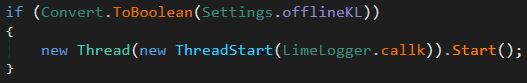 After this thread is created the sample will check the value of the field Settings.offlineKL, if it's set to true the sample will initialize the built-in keylogger on the host. This sample utilizes LimeLogger, this keylogger is a simple C# keylogger maintained by the RAT's author NYAN-x-CAT.