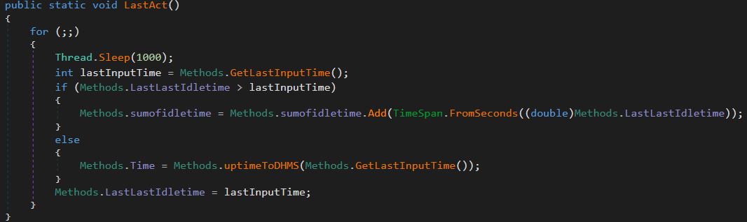 After the sample is installed and establishes persistence on the victim's machine, it will set the thread's state to prevent it from sleeping. Then, it creates a new thread with the function LastAct().