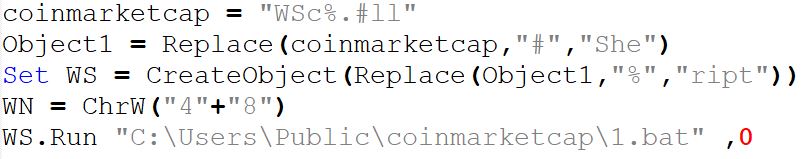 Once the scheduled task is executed it will then run coinmarketcap.vbs, this stage's responsibility is to run the dropped batch file 1.bat with Wscript.