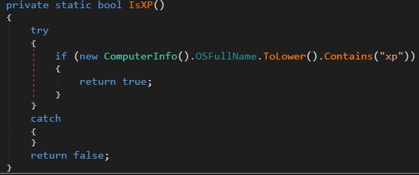 The last technique used to try to evade detection is to determine if the sample is running on a Windows XP machine.