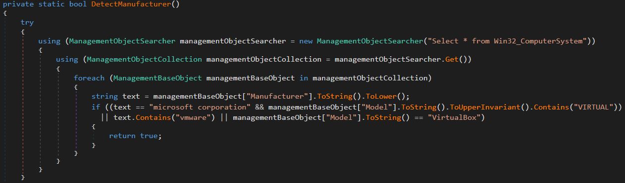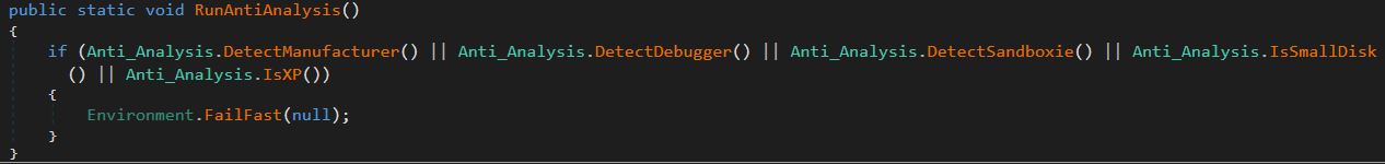 When this function is run it will call several other functions to employ different anti-analysis techniques. This sample calls the functions Anti\_Analysis.DetectManufacturer(), Anti\_Analysis.DetectDebugger(), Anti\_Analysis.DetectSandboxie(), Anti\_Analysis.IsSmallDisk(), Anti\_Analysis.IsXP() to attempt to not be analyzed.