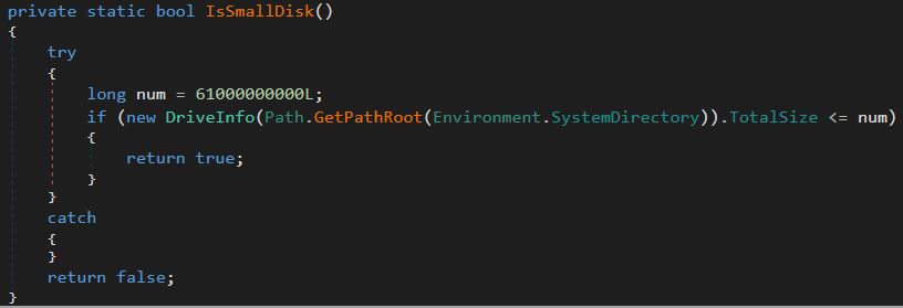 After the sample determines that it's not being run in a sandbox it will try to employ another technique to determine if it's being run in a virtualized environment, it does this by getting the disk's size and compares it to a constant. In this case, it will check if the disk is larger than 61GB.
