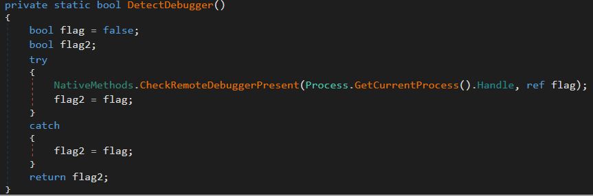 <figure><img src="https://3892796155-files.gitbook.io/~/files/v0/b/gitbook-x-prod.appspot.com/o/spaces%2FZt3ly4wOcBID8vwUbybj%2Fuploads%2FsNtmp04qgCK8DTuiVBKg%2FDetectDebugger.JPG?alt=media&#x26;token=37d31b2f-86e4-4993-8a0a-61ac8e971aba" alt=""><figcaption><p>Detect Debugger function</p></figcaption></figure>