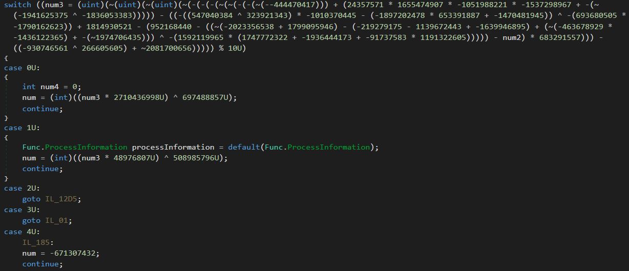 Sample uses complex math to determine what case to switch to, this behavior is indicative of the malware author employing ConfuserEx to obfuscate the DLL.