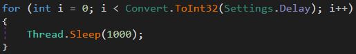 When main is run it starts by entering a for loop where the escape condition is determined by the settings field "delay". Inside the loop contains the command Thread.Sleep(1000). This means that this sample will sleep for a total of three seconds before any more code is executed.