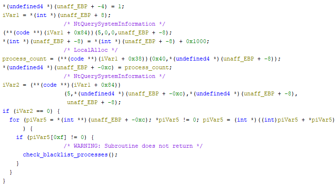Once the registry check has been bypassed the sample then checks for processes related to virtualization. It does this by calling NtQuerySystemInformation to get a list of running processes, then calling another function responsible for comparing the list of running processes to a list of blacklisted processes. These processes include "qemu-ga.exe", "qga.exe", "windanr.exe", "vboxservice.exe", "vboxtray.exe", "vmtoolsd.exe", and "prl\_tools.exe". If one of the blacklisted processes is found running on the system the sample will terminate itself.