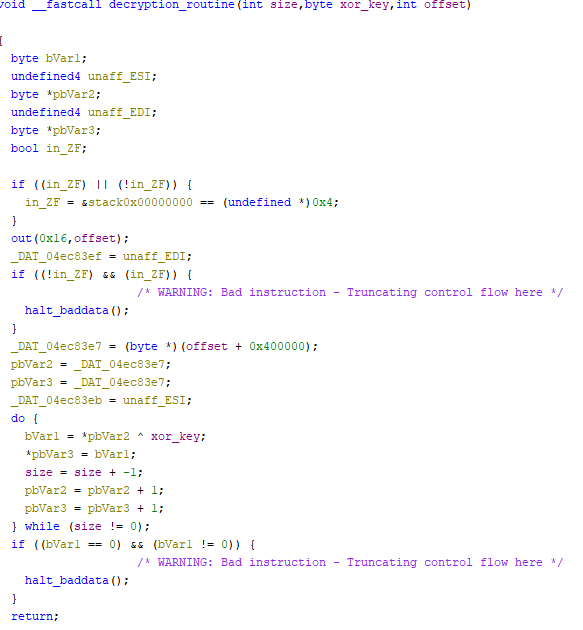 After the section has been decoded, the sample will then execute the section and re-encode the section after it's finished executing. This allows the sample to avoid saving a decoded copy of itself in memory, preventing an analyst from dumping a clean sample. Another roadblock this technique introduces is the inability to set software breakpoints. Due to how software breakpoints work, any section that has one set would be clobbered with junk code, meaning I only had four hardware breakpoints at my disposal. Some crafty conditional hardware breakpoints can be used to add to the four breakpoint limit. This is cumbersome and annoying to use, so I mostly avoided using them in my initial analysis.
